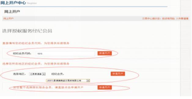 3、點擊“網(wǎng)上開戶”進入選擇:(方式一:若您有為自己服務(wù)的經(jīng)紀(jì)會員,可以直接輸入代碼,點擊申請開戶;方式二:自行選擇經(jīng)紀(jì)會員,點擊選擇地區(qū),選擇經(jīng)紀(jì)會員,申請開戶;方式三:直接點擊申請開戶)