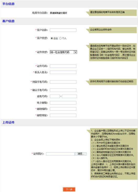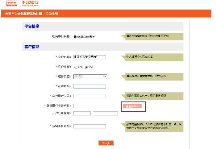 輸入會員在該交易市場的會員代碼、綁定銀行卡號、開戶行、動態(tài)口令,點擊“下一步”如圖: