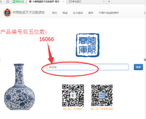2、進入中國陶瓷藝術(shù)品數(shù)據(jù)庫官網(wǎng)頁面,在圖二的選中區(qū)域輸入圖一中產(chǎn)品編號后五位數(shù)字“16066”,即可檢索到該編號產(chǎn)品可供對外查詢信息(每個產(chǎn)品對外可查詢一個體視顯微鏡照片數(shù)據(jù))