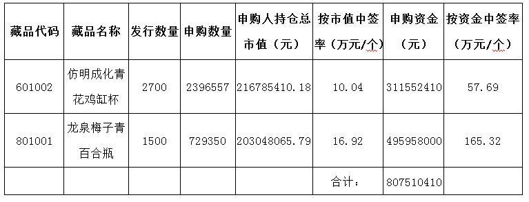 本次中簽分配方式按持倉市值優(yōu)先分配規(guī)則,請廣大參與申購的投資會員關注交易賬號中持倉數(shù)量和資金變化情況?!斗旅鞒苫嗷u缸杯》、《龍泉梅子青百合瓶》將于2016年9月26日正式掛牌交易。